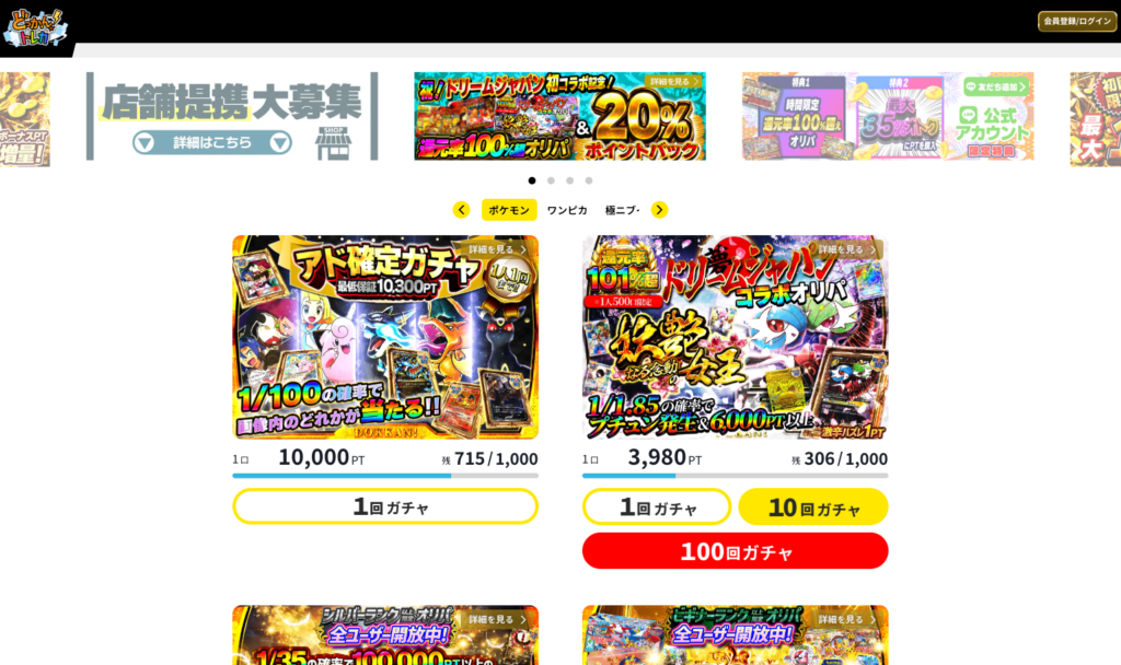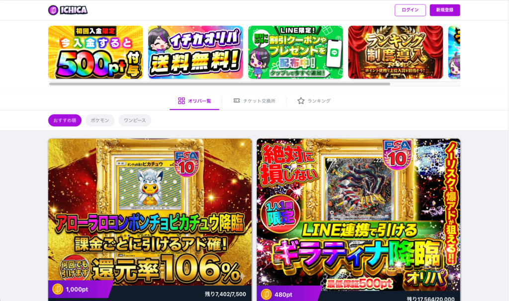 総口数が1000口以下に抑えられたオリパが中心で、当選確率の高さも評価されています。