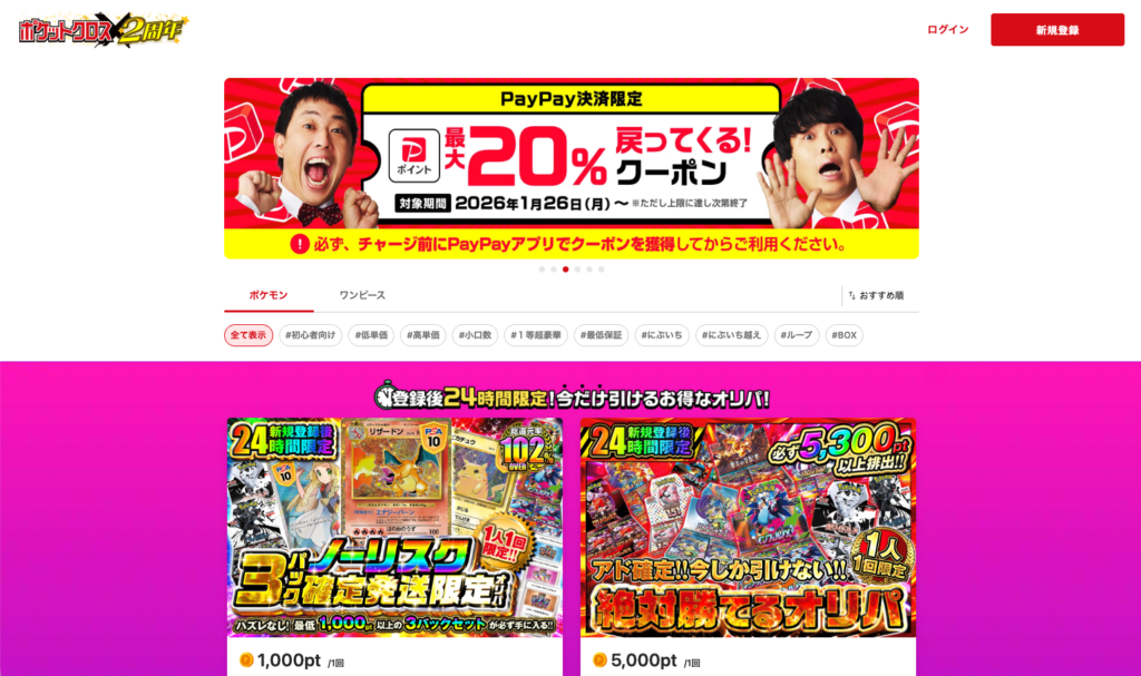 100円からオリパが引けるので、まずは少額で遊んでみて、サイトの雰囲気を掴んでから本格的に課金するのが賢い使い方でしょう。